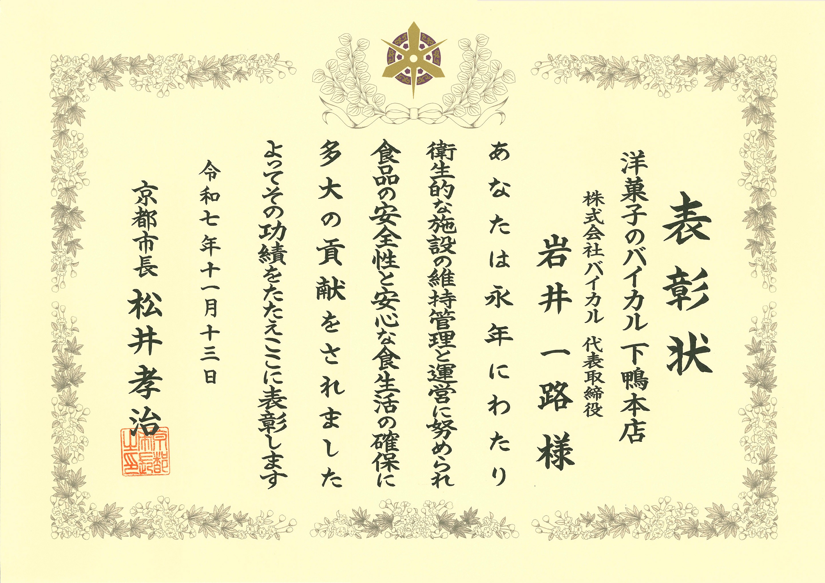 洋菓子のバイカル下鴨本店は、令和7年度「食品衛生に関する表彰」において、 京都市長表彰「食品衛生優良施設」に選ばれました。