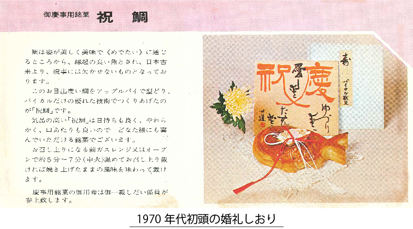 バイカルの「祝鯛(いわいだい)」は、記録をさかのぼっていくと、なんと、1962年にはすでに販売しており、 60年以上も前から、沢山の方のお祝いにお使いいただいておりました。