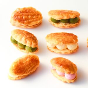 そんな女性目線の気づきから、小さな葉っぱの形のパイでバタークリームをサンドしたひとくちサイズで食べやすいパイを考案しました。