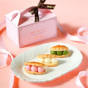 フレッシュバターとチョコレートをベースに、ストロベリー、バニラ、抹茶の3種類のお味のクリームを可愛らしく絞っております。