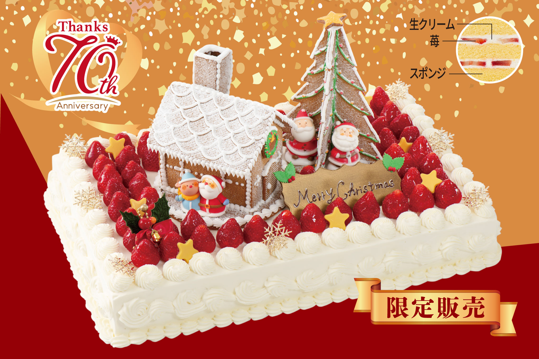 ヘクセンハウスとクリスマスツリーが飾られた、豪華な特製生クリームケーキ。